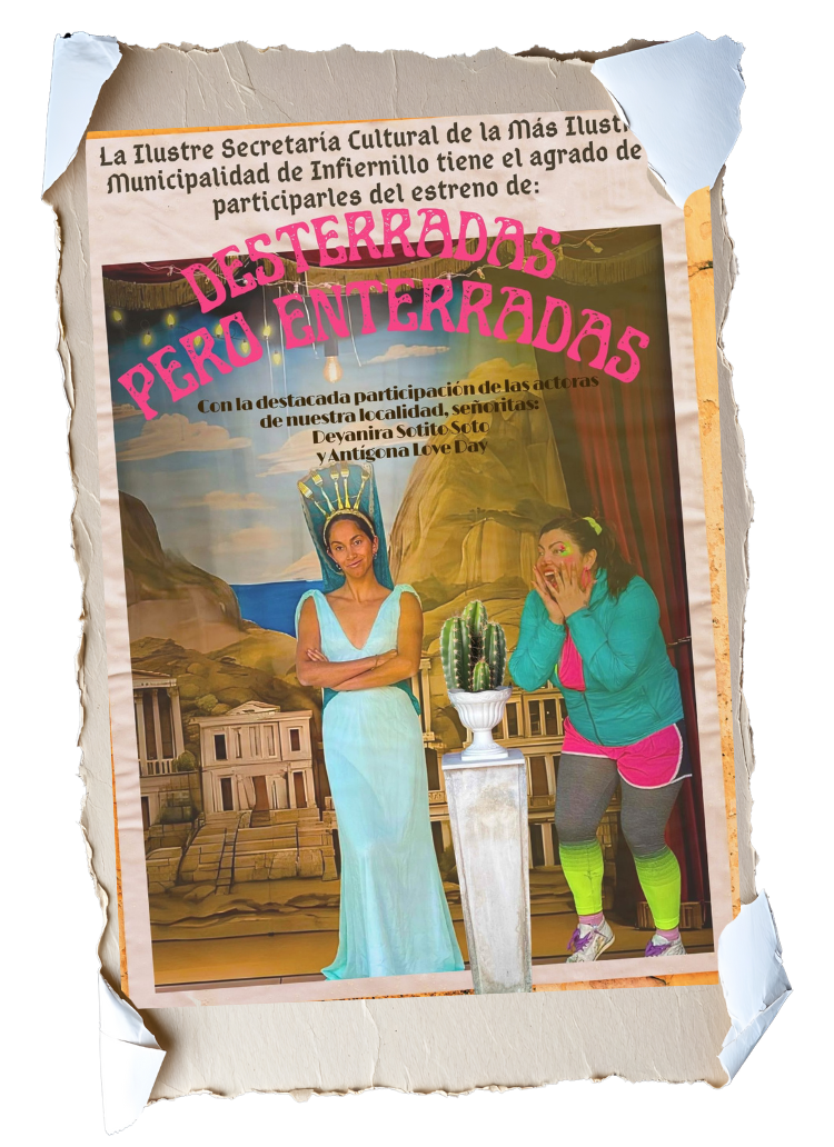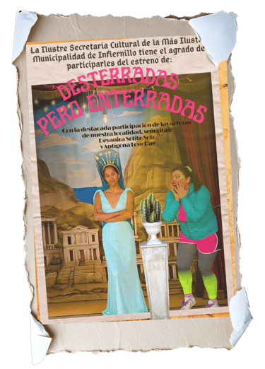 Medea y Antígona, reencarnadas en versión kitsch, transforman sus dramas milenarios en parodia política, farándula sentimental y crítica social. Entre sopaipillas, luces LED y declaraciones incendiarias, se preguntan: ¿quién no ha querido enterrar a su hermano o funar a su ex? Un cierre hilarante, festivo y agudamente actual que mezcla tragedia clásica con cultura pop. Porque si el teatro es una caja... ¡estas dos vinieron a romperla!